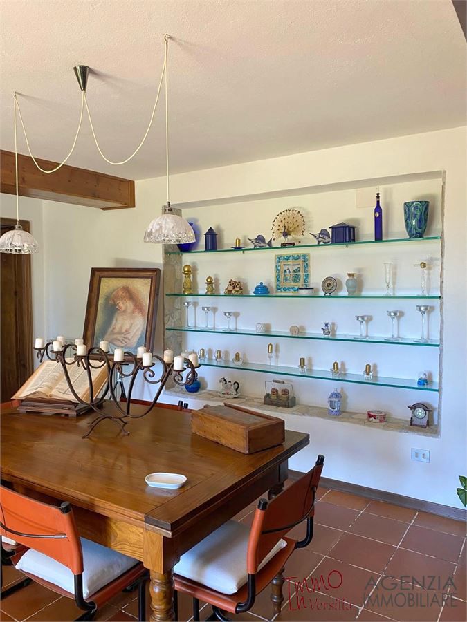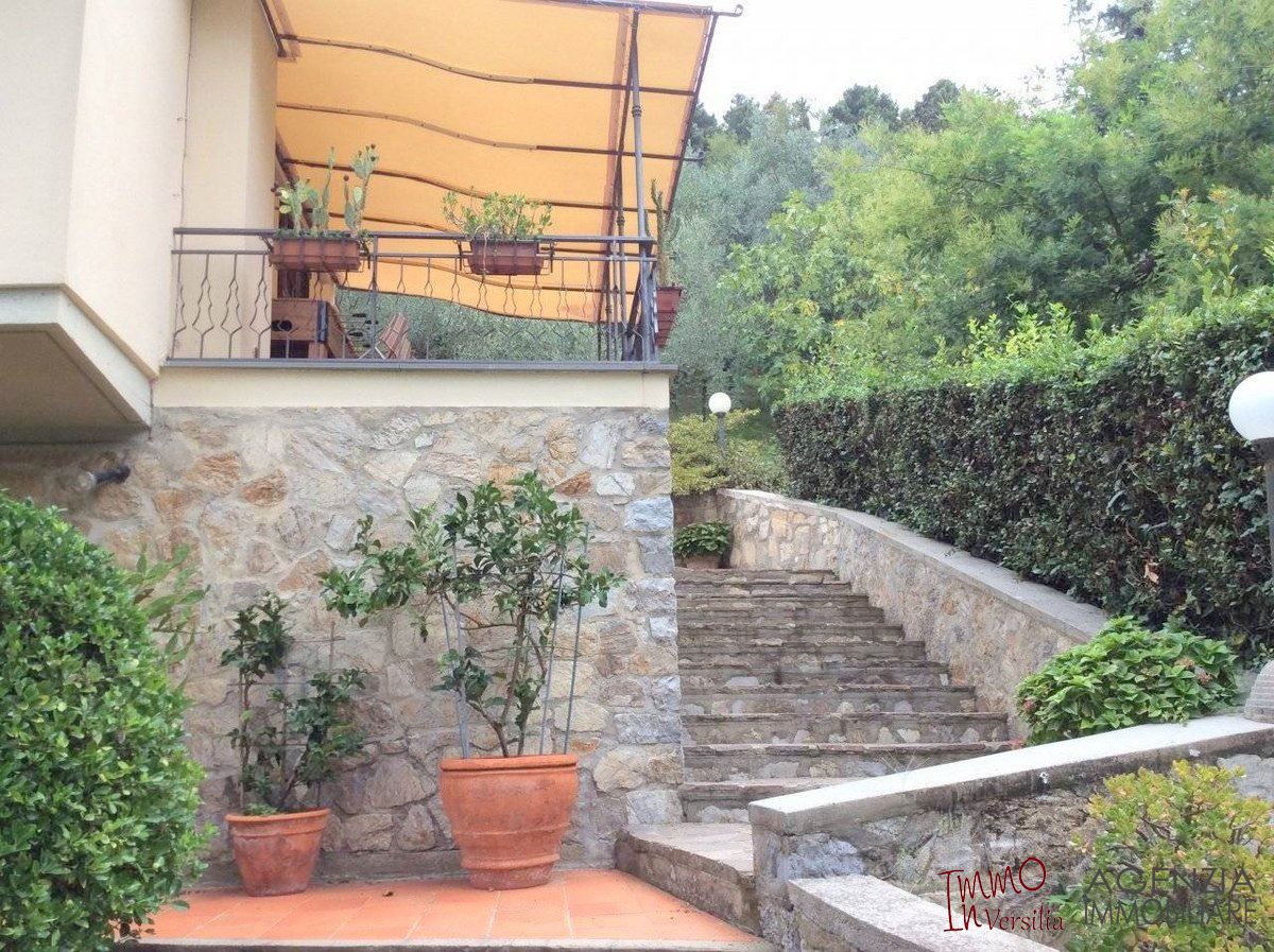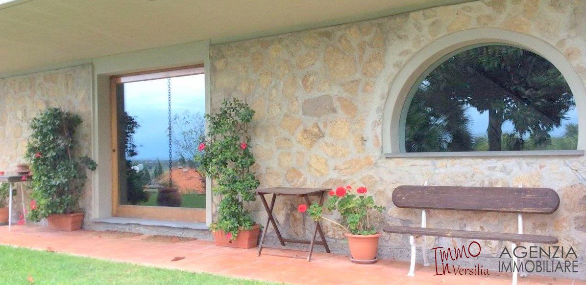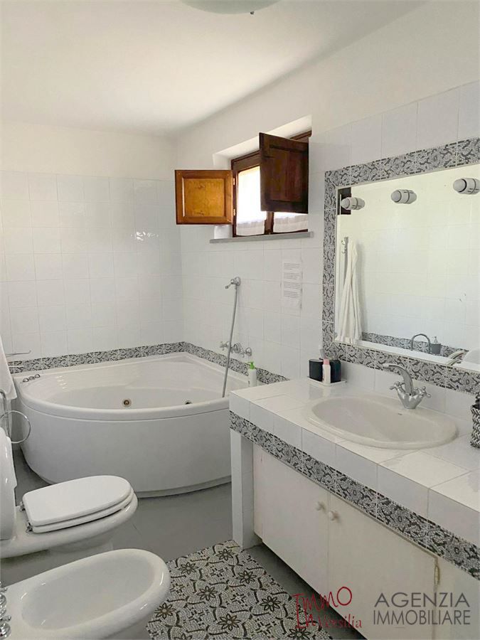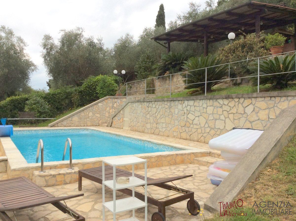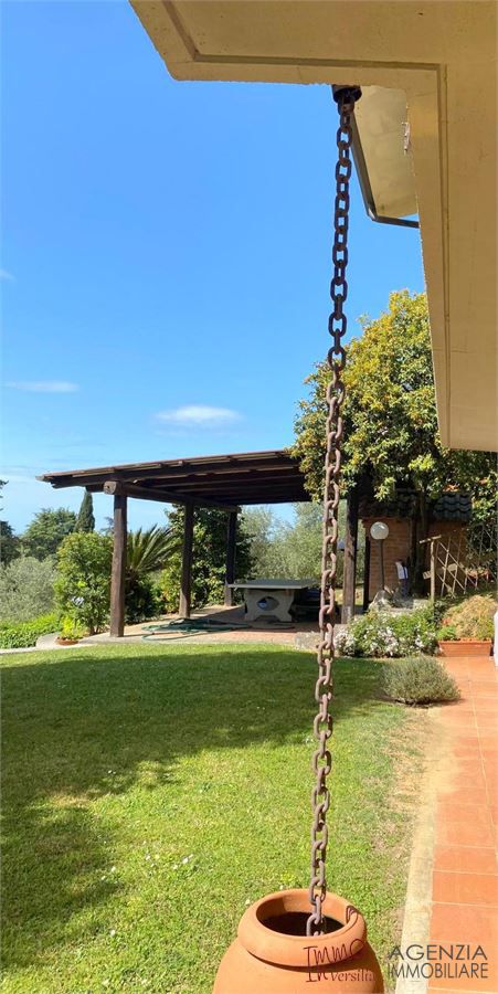 Bella villa in posizione dominante e facile da raggiungere, con ampio giardino e piscina, vista mare: si articola su due piani fuori terra in ampio salone con caminetto, zona pranzo e relax, vista sul giardino-piscina-mare, camera matrimoniale, bagno e ripostiglio al piano terra; primo piano cucina, salotto, due camere un bagno e ripostiglio. Ampio garage di 20mq, spogliatoio e ripostiglio di servizio alla piscina ed al giardino, balconi e terrazza vista mare. Area coperta attrezzata in esterno con forno e tavoli da vivere e godere grazie alla fortunata posizione riparata e soleggiata tutto l''anno. Molto curata nei particolari e nei materiali utilizzati è dotata di sistema di allarme, porta blindata, doppi vetri oltre al giardino con ampio pergolato vivibile e piscina con servizi ed attrezzature perfettamente funzionanti. Possibile ampliamento. - Maggiori Dettagli: Videosorveglianza, Porta blindata, Cassaforte, Camino